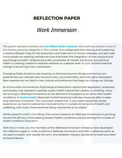 Ang isang halimbawa ng reflection paper ay isang pagsusuri o paglalahad ng sariling karanasan, mga natutunan, at mga emosyon na may kaugnayan sa isang partikular na paksang pinag-aralan o naranasan. Sa pamamagitan ng pagsulat ng reflection paper, nagkakaroon ang isang indibidwal ng pagkakataong magpahayag ng kanyang sariling mga saloobin at mga reaksyon.