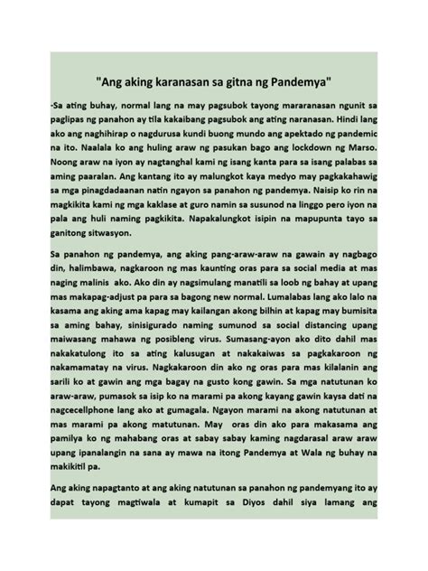 Sa kabuuan, ang aking karanasan ay isang mahalagang bahagi ng aking buhay. Ito ang naglalaman ng mga natutunan, pagkakamali, at tagumpay na nagbigay-daan sa aking pag-unlad bilang indibidwal. Sa pamamagitan ng pagsasalin ng aking karanasan sa iba, ako ay naglalayon na makapagbigay ng inspirasyon at kaalaman sa iba, habang patuloy na nagpapalawak ng aking sariling kamalayan at pag-unlad. Mahalaga na ipagpatuloy ang pagbabahagi ng aking karanasan upang maging instrumento ako ng pag-asa at positibong pagbabago sa aking komunidad at lipunan.