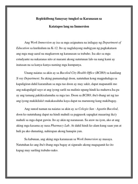 Samantala, ang pangunahing mga punto na dapat tandaan sa pagsulat ng Reflection Paper Tungkol sa Karanasan at mga kaugnay na keyword ay ang mga sumusunod: pagsasalaysay ng personal na karanasan, pag-uugnay ng mga natutunan sa karanasan, paglilinaw ng mga emosyon at reaksyon, at pagbibigay ng mga pagbabago at pag-unlad na naganap. Sa pamamagitan ng paggamit ng mga salitang tulad ng una, pangalawa, at samantala, nabibigyang-diin ang pagkakasunod-sunod ng mga punto. Sa ganitong paraan, nagkakaroon ng malinaw at organisado na pagpapahayag ng mga ideya na nakapaloob sa Reflection Paper Tungkol sa Karanasan.